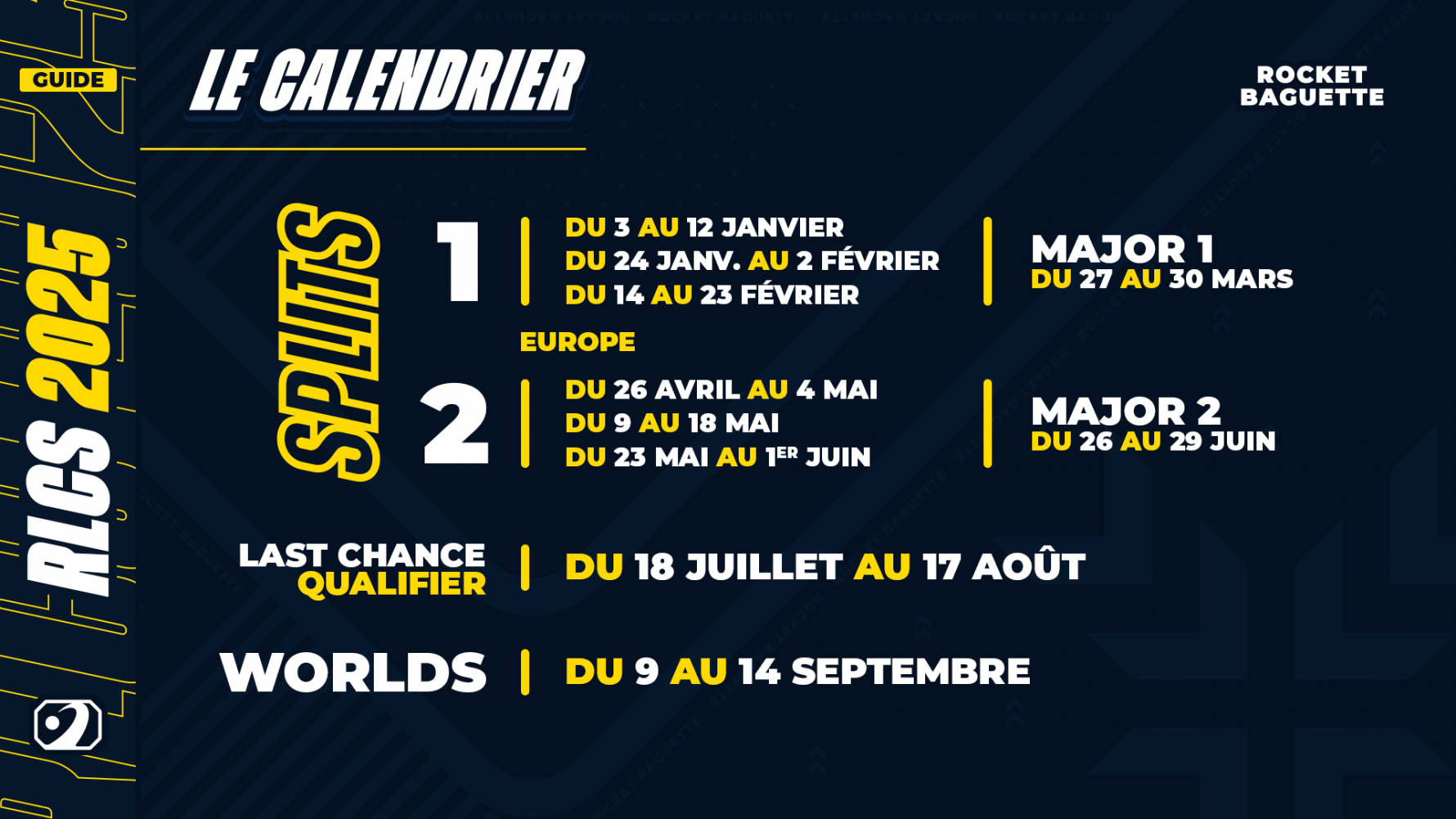 officiel de Rocket League. La saison 2025 s’étend de janvier à septembre 2025 !Les équipes de 7 régions peuvent participer aux RLCS 3 contre 3 : Europe (EU),